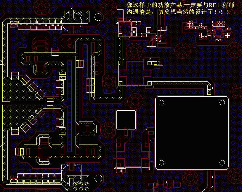 下面看一個功放項目pcb設計,其實我們平常大部分板子上面只會有一小段或者一小部分有RF信號,但是有些板子,整板都是RF信號。那這個時候的處理,建議layout工程師要和RF工程師一起來設計了,就像我們前面說的那樣,一個器件的位置,一小段線的長寬,都非常可能影響到他的性能。