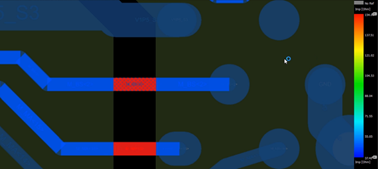 下面顯示了一個示例,其中沿跡線的大阻抗變化以紅色標記。應該調整該區域中跡線之間的間隔,以消除此阻抗變化或使其處于可接受的公差范圍內。您可以在設計規則中定義所需的阻抗容限,布局后阻抗計算器工具將根據所需的阻抗值檢查布線。