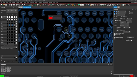 PCB布局工具中的其他功能也可以幫助您完成工作。其中包括3D查看和檢查功能以及可在設(shè)計仍在布局時使用的大量仿真工具。在上圖中,您可以看到 IR Drop Vision 查看器,這將幫助您確保所有連接都接收到其功能所需的適當電量。IR Drop Vision 是對混合信號 PCB設(shè)計進行完整 PDN 分析的第一步,可以幫助您避免使用多個原型構(gòu)建進行昂貴的調(diào)試和測試。