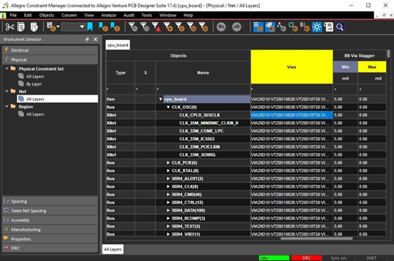 我們已經(jīng)看到了使用約束管理器為跟蹤路由設(shè)置設(shè)計規(guī)則的重要性。在對混合信號設(shè)計進行布線時,這對于標準布線、差分對、阻抗控制走線、不同模擬信號以及電源和接地走線所需的所有不同走線寬度都有很大幫助。但是跟蹤路由規(guī)則并不是 Cadence 的約束管理器控制的唯一規(guī)則。它還將控制組件間隙、通孔類型、測試約束,甚至是信號完整性和時序等電氣屬性。