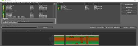 PCB設計工具中的過孔列表顯示了不同過孔的類型和配置